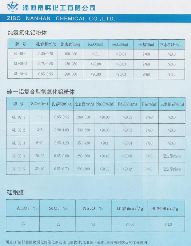 本產(chǎn)品主要用作催化劑載體—活性氧化鋁的原料,如作為加氫催化劑原料以及用作制造加氫催化劑載體、氧氯化催化劑載體等。也可用作分子篩、硅酸鹽耐火纖維制品的成型粘結(jié)劑、如作為半合成稀土 Y 型分子篩裂化催化劑的粘結(jié)劑。本產(chǎn)品是作各種鋁鹽的良好原料,經(jīng)成型加工后,可作不同形狀的干燥劑、吸附劑和催化劑載體。